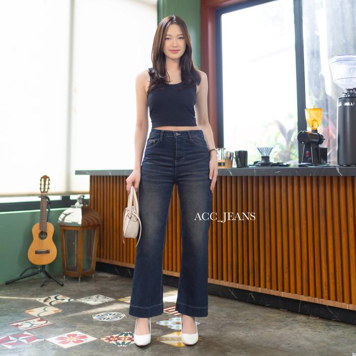 Accjeans - Celana Highwaist Loose Jeans Wanita Lipat Lebar - Straight Jeans Baggy Stretch Soft - Celana Panjang Wanita -