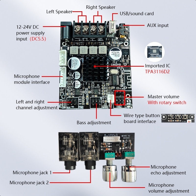 Wuzhi Audio | ZK-502T Modul Power Amplifier Audio Bluetooth 2.1 Channel 50W+50W Dengan 2 Port Mikrofon TPA3116D2 -BELL