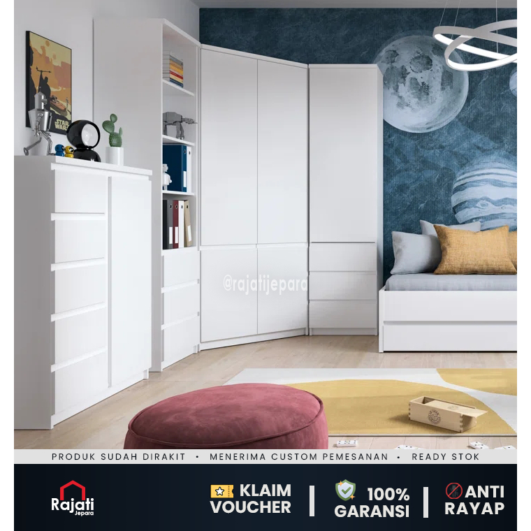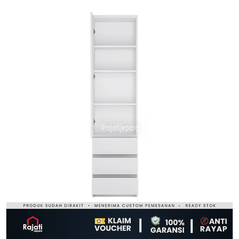 Lemari Pakaian Minimalis 1 Pintu + 3 Laci – Kayu Multiplek Warna Putih – Rajati Jepara