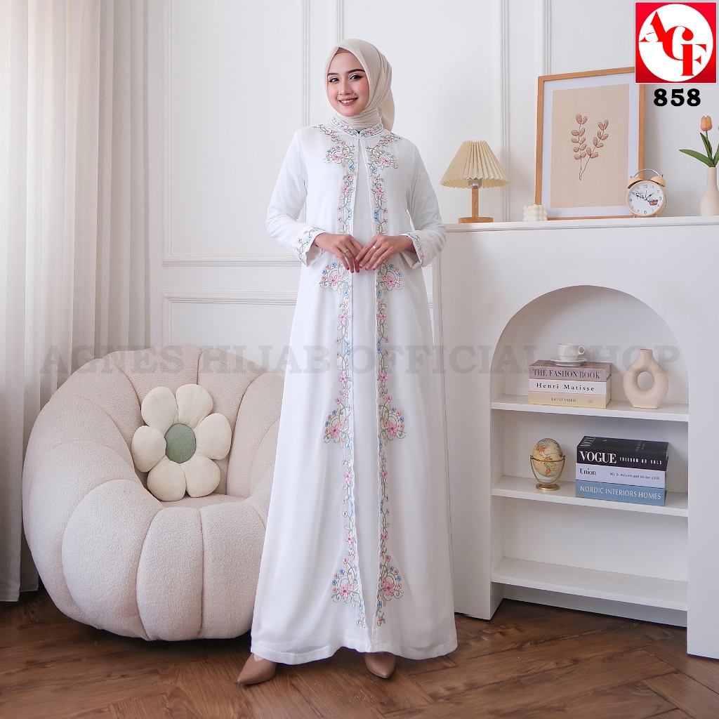 Agnes Hijab - Noura Dress Gamis Putih lebaran 2026 Terbaru Abaya Bordir Bunga Baju Muslim Wanita Dewasa Simple Elegan Gaun Pesta Haji Umroh 858