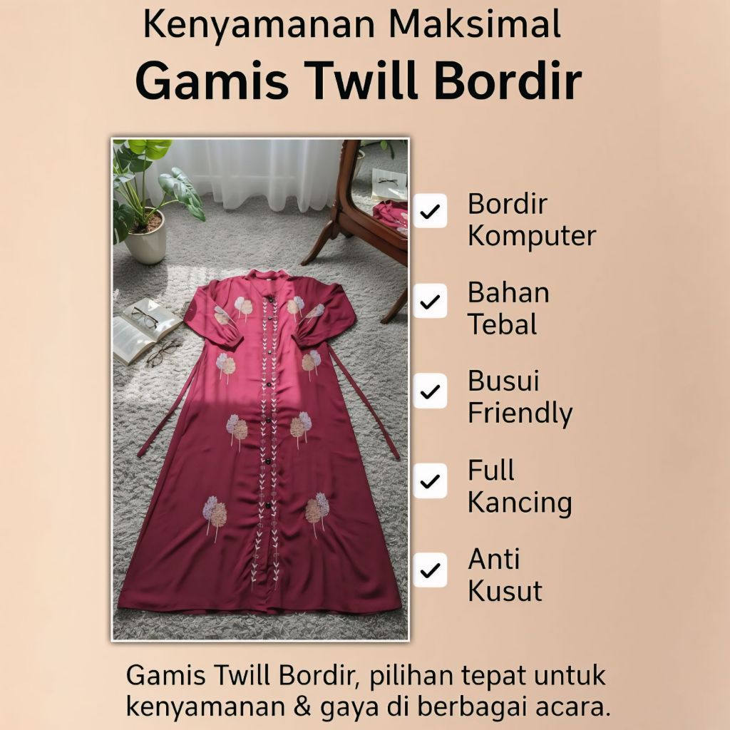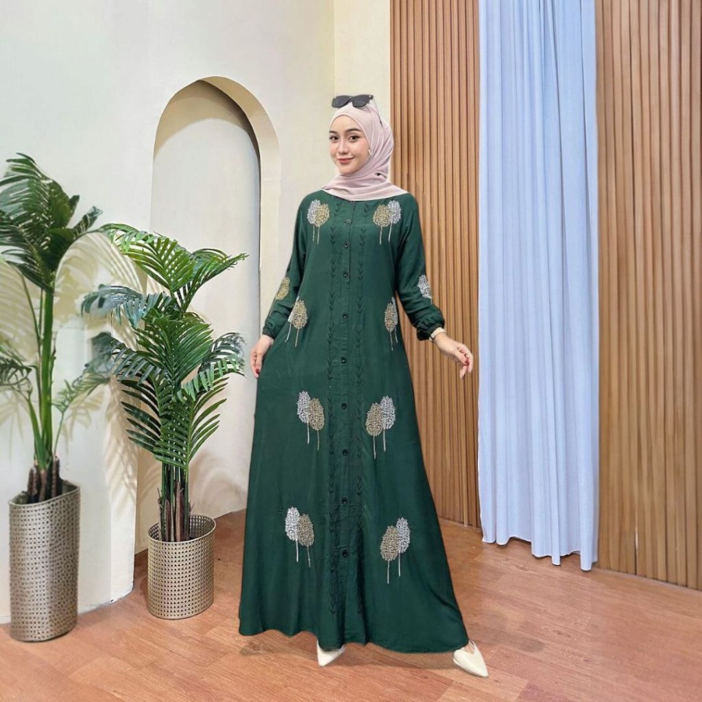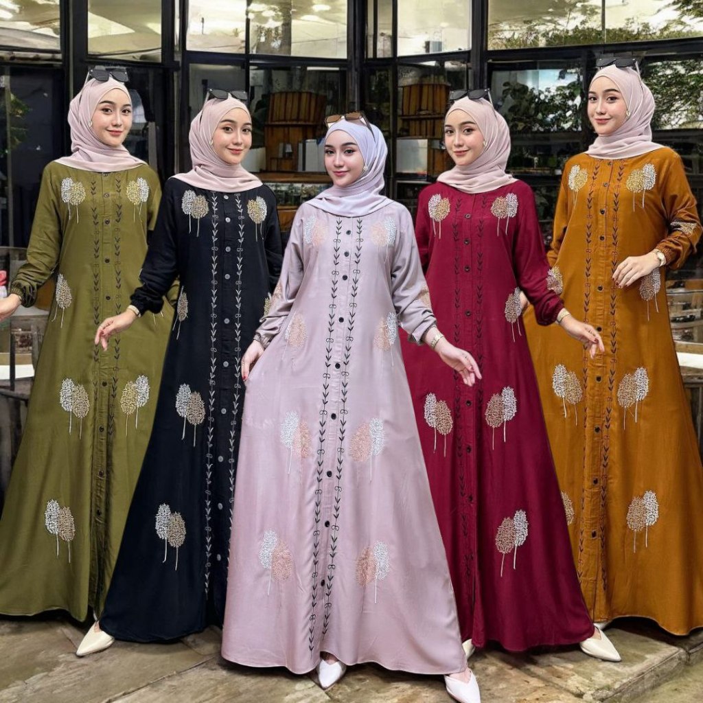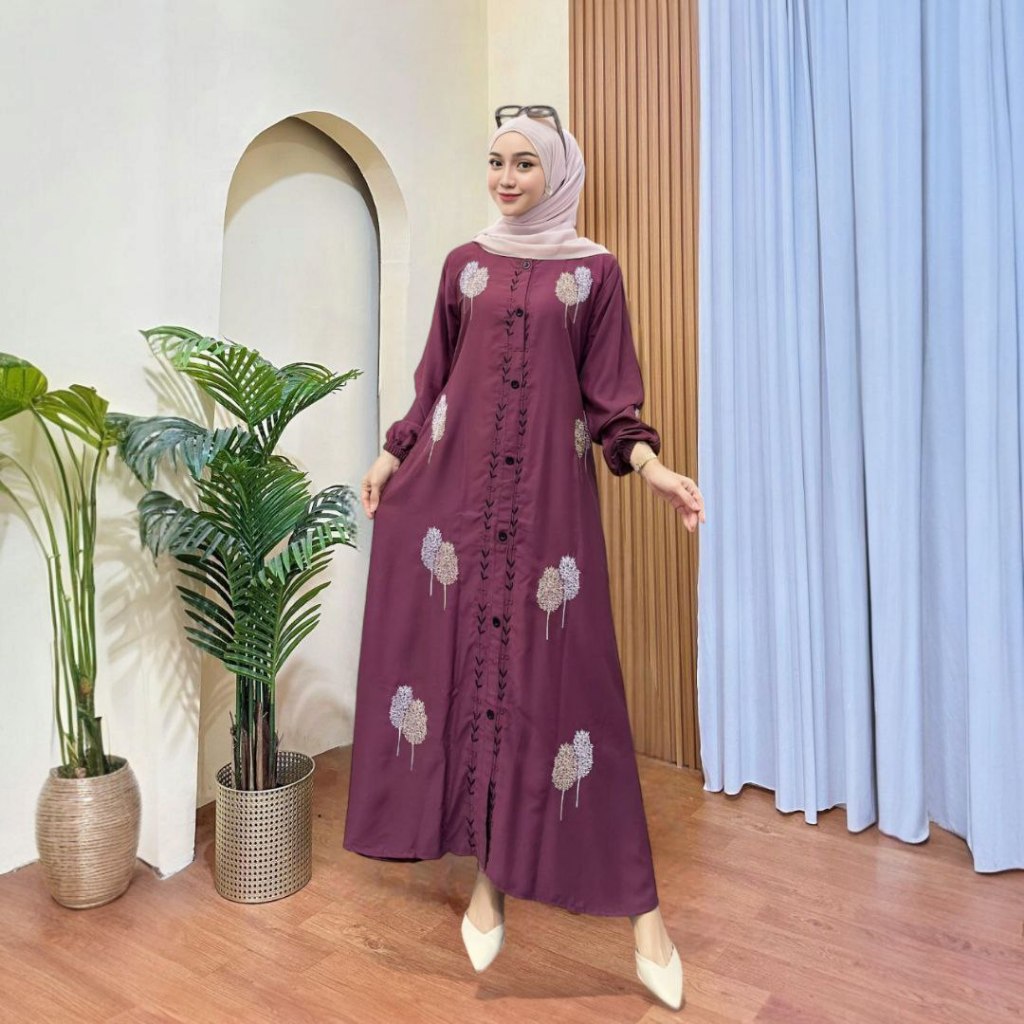 Maxi Dress Twill Bordir Terbaru M L XL XXL - Gamis Kekinian TERBARU 2025 - Gamis Twill Import Bordir Kekinian Full Variasi Kancing Depan Lengan Karet