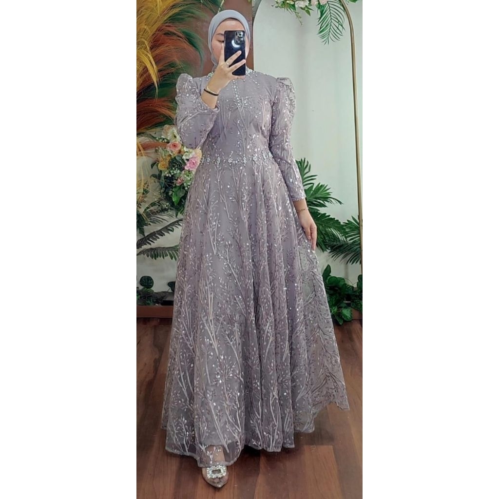 gamis dress bella bahan tille bordir wanita muslim mewah kondangan