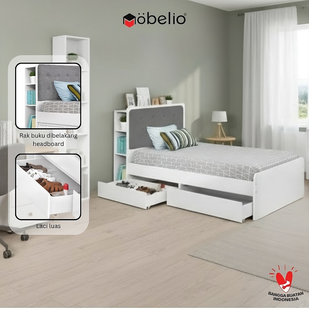 MOBELIO - Ranjang Dipan Single dengan Laci Rak 120 x 200 Modern Minimalis Putih Abu - Eclipse