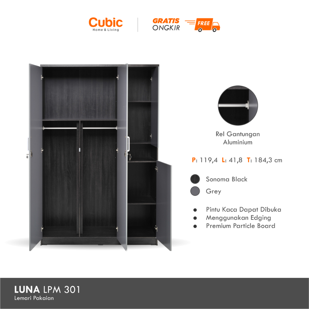 Cubic Lemari Pakaian Cermin Minimalis 3 Pintu / Lemari Baju - LUNA LPM 301