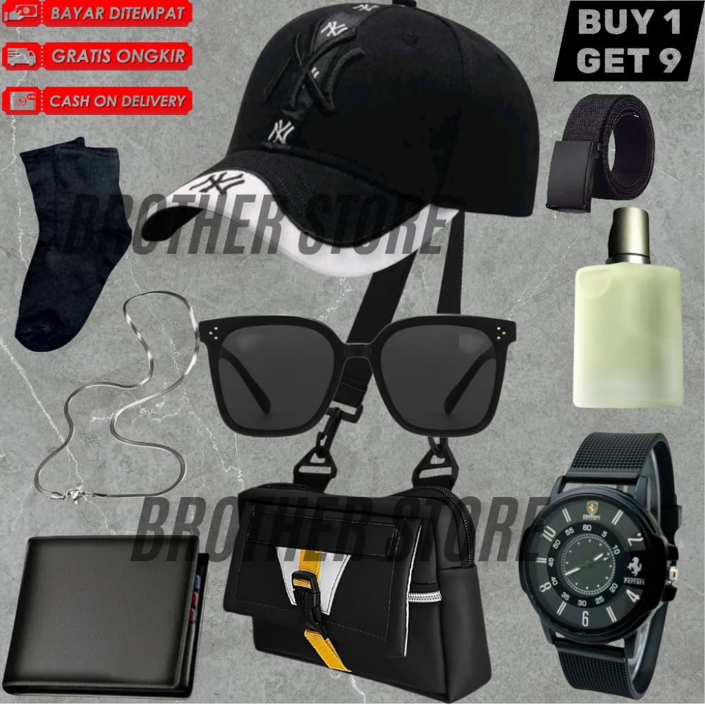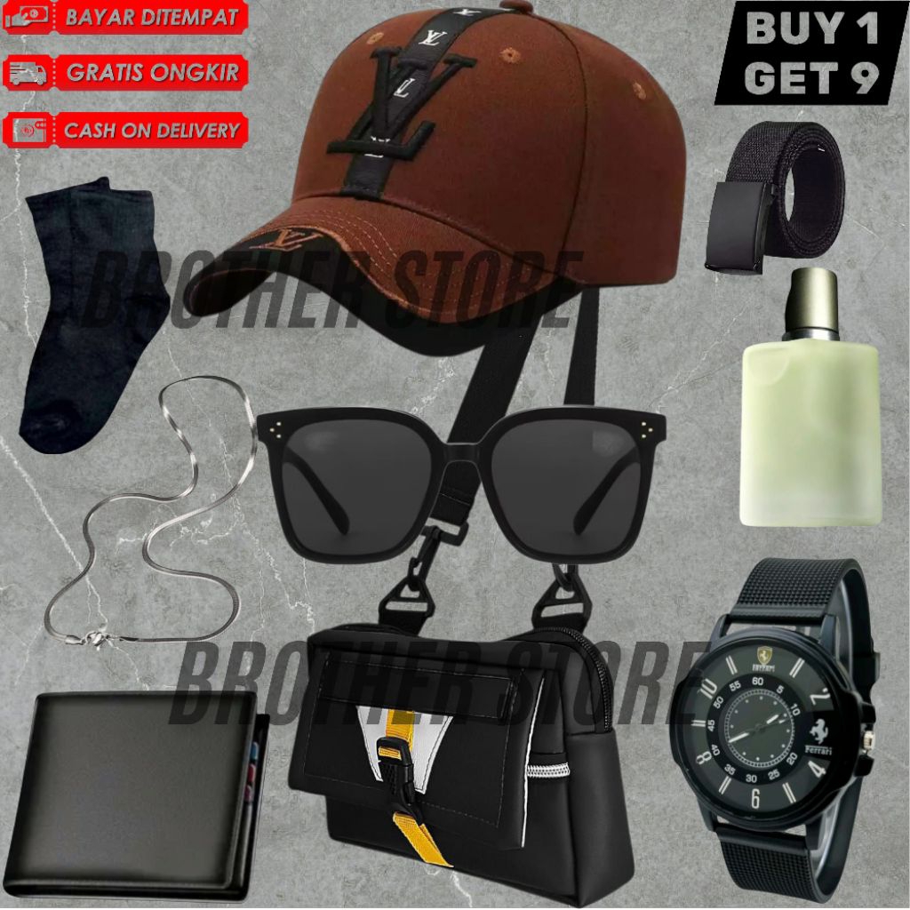 Promo Paket Istimewa Pria Keren Pria Terbaru Jam Tangan Pria 9IN1/6IN1 Beli Jam Tangan Analog Gratis Tas Selempang,Topi,Kacamata,Parfum,Kaoskaki,Gesper Kanvas,Kalung Titanium,Dan Juga Dompet