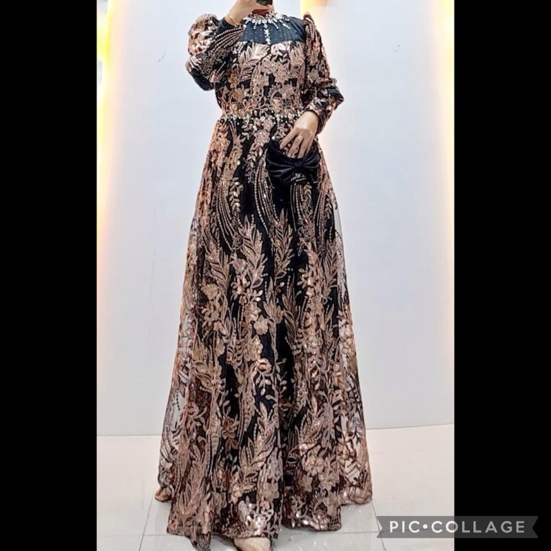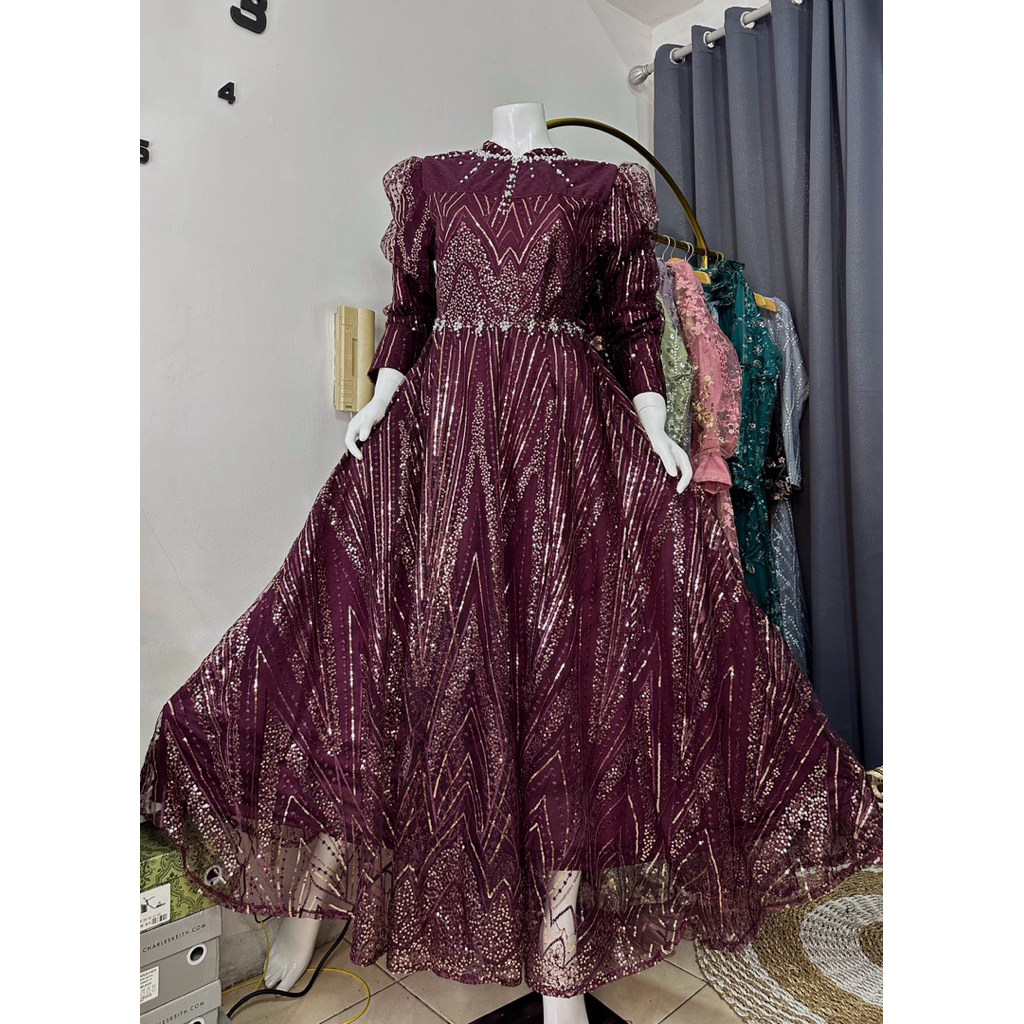 gamis dress bella bahan tille bordir wanita muslim mewah kondangan