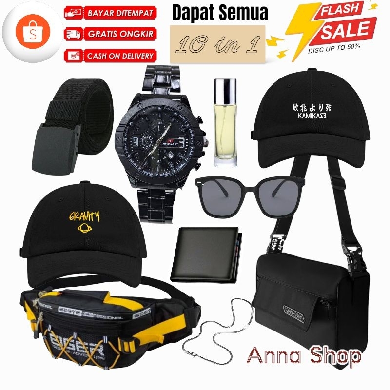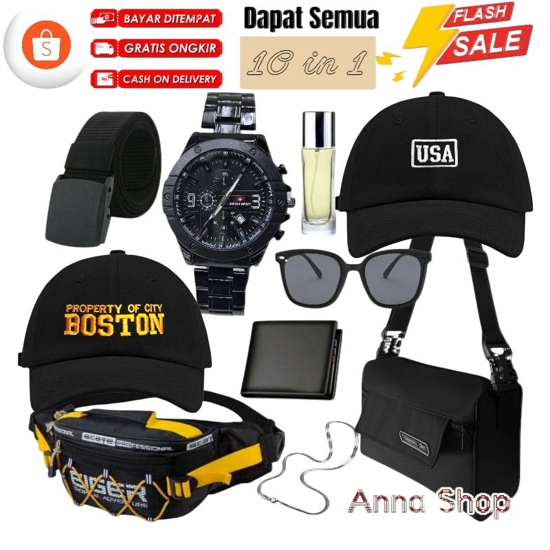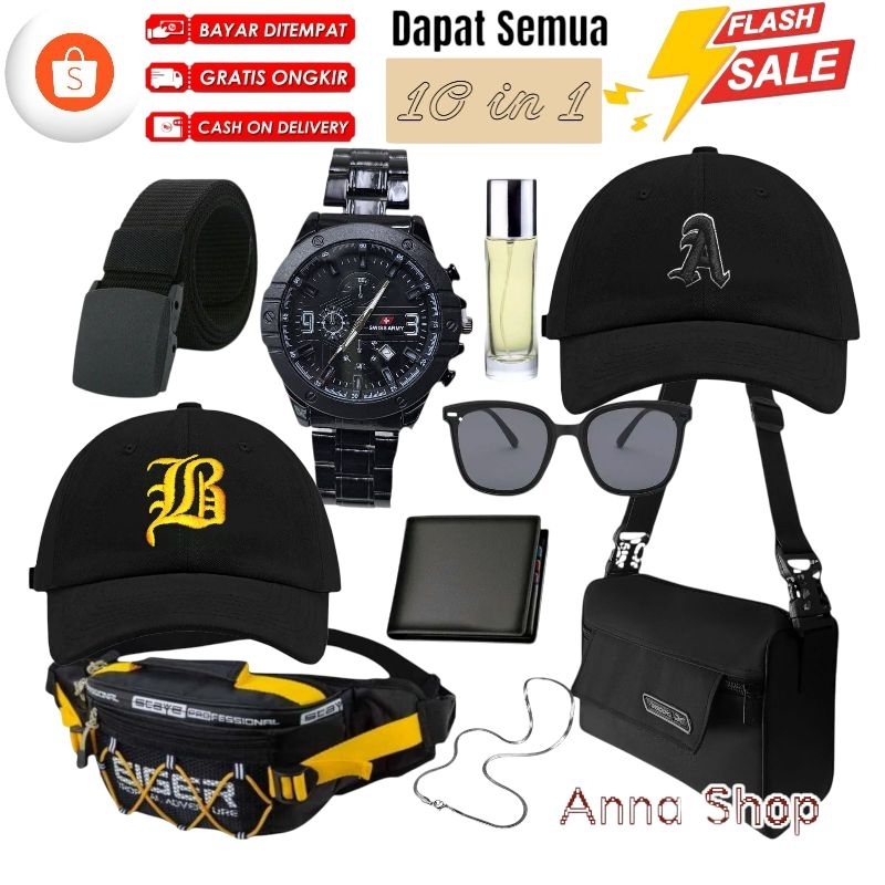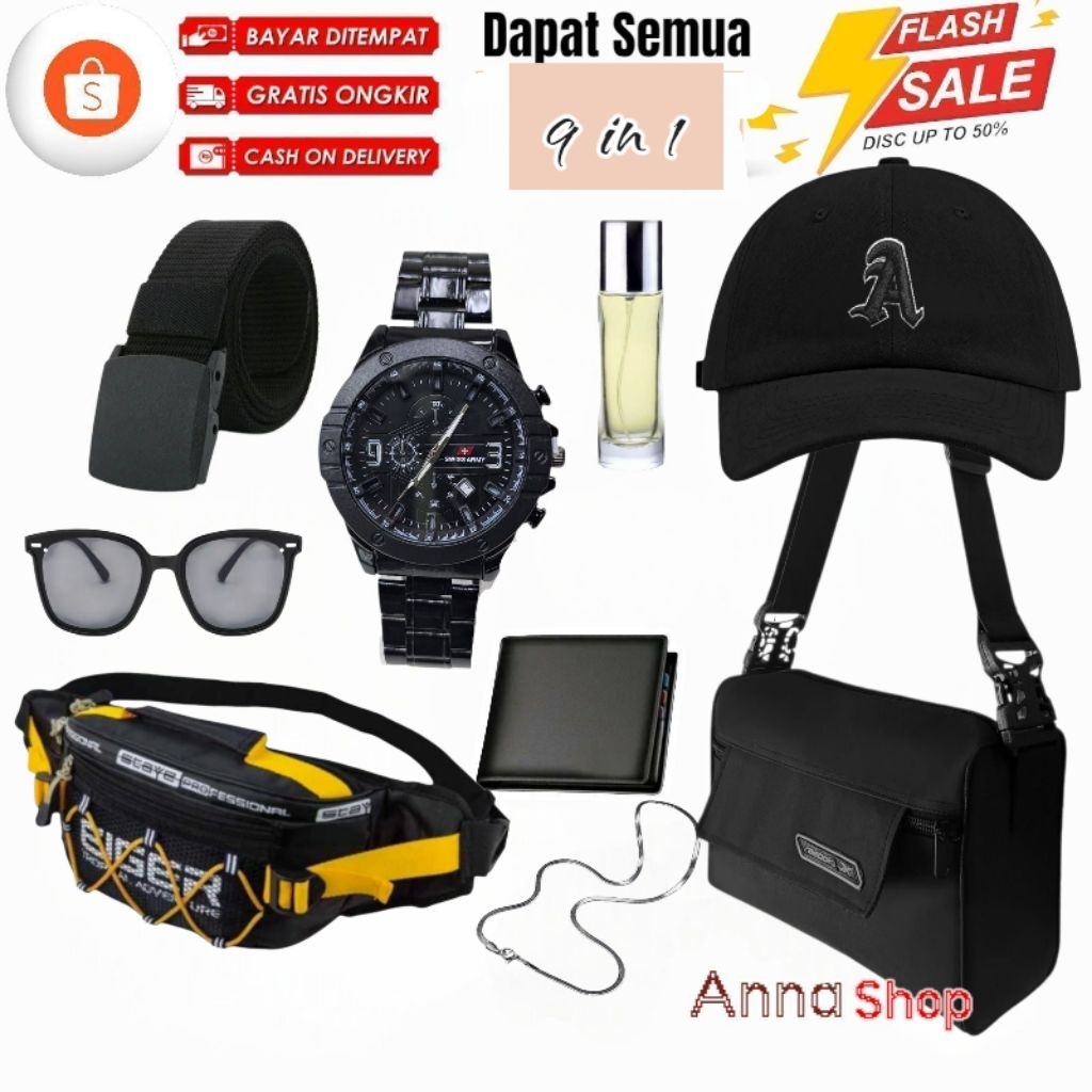 [ANNA SHOP] Paket Terlengkap Bundling 10 in 1 Dapat Topi Tas Jam Tangan Gesper Ikat Pinggang Dompet Kacamata Parfum Unisex Pria dan Wanita