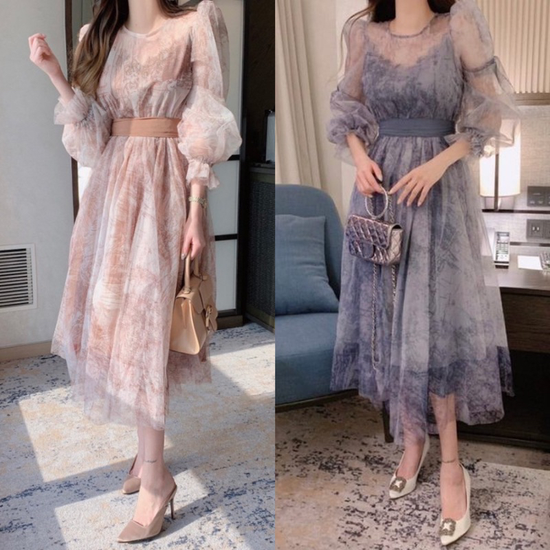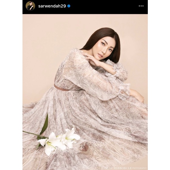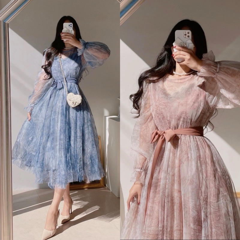 Lucinta Dress Korean Floral Dinner Mewah Elegant Spring Prewed Tile Flare Gaun Cantik Mekar Lengan Panjang Poplin Manis