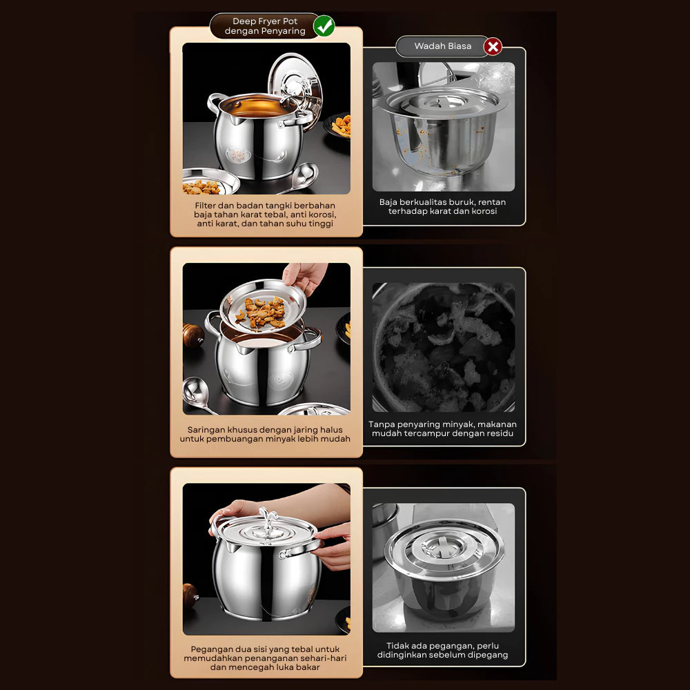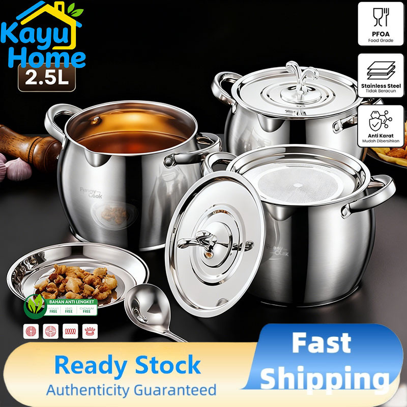 Kayu Home Deep Fryer Multifungsi Penyaring Minyak Bahan Stainless Steel Anti Karat Tebal Panci Kapasitas 2.5L Free Cento