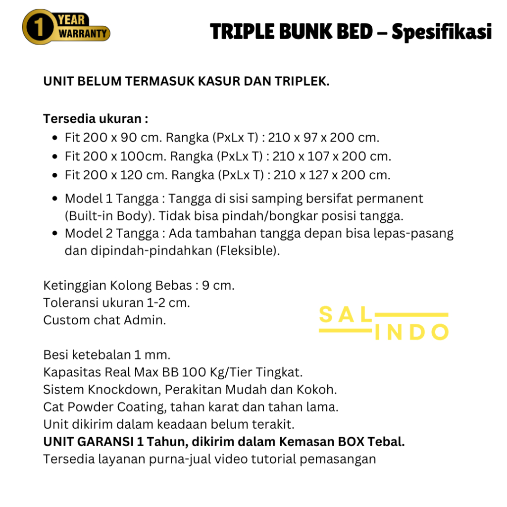 Metal Triple Bunkbed Ranjang Besi 3 Tingkat 90x200 100x200 120x200 (S3)