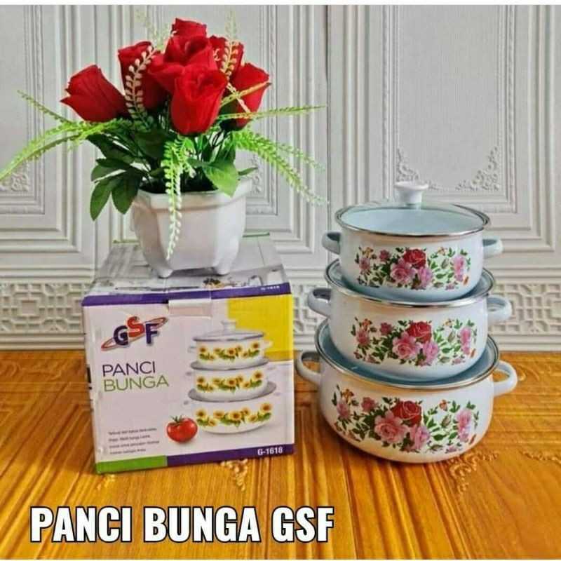 PALING LAKU TERLARIS Panci Set Enamel Motif Kembang 3 pcs / Gratis Packing Double Dus dan Bubble Wrap / Panci Susun Moti