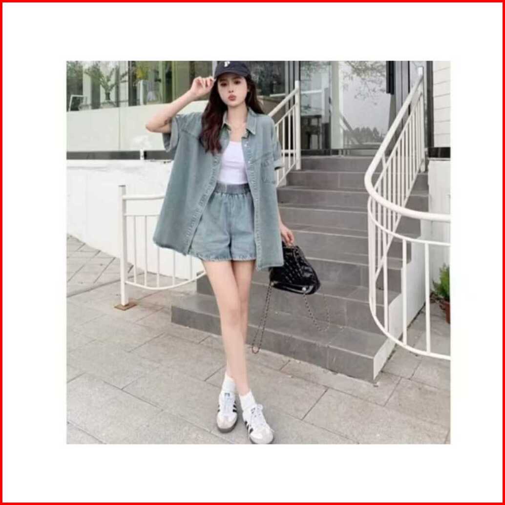 Oneset Kemeja Denim Retro Kasual Longgar Kemeja Denim Kasual Dan Celana Pendek Fashion Korean Style