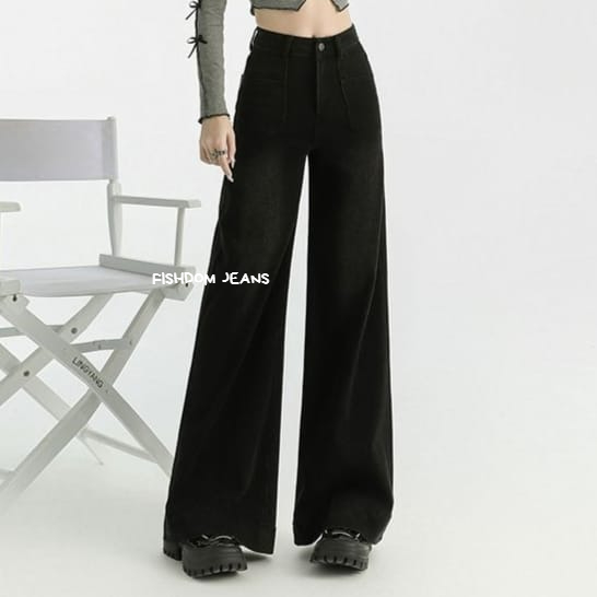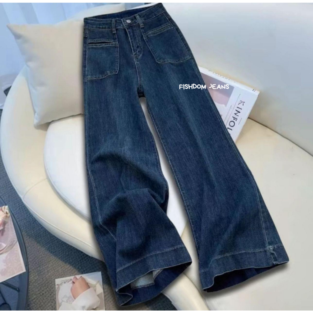 Celana Kulot HighWaist Kantong Depan Jeans Wanita Melar Skena Wide Leg Kantong Depan Jins Gombrong Panjang Cewek