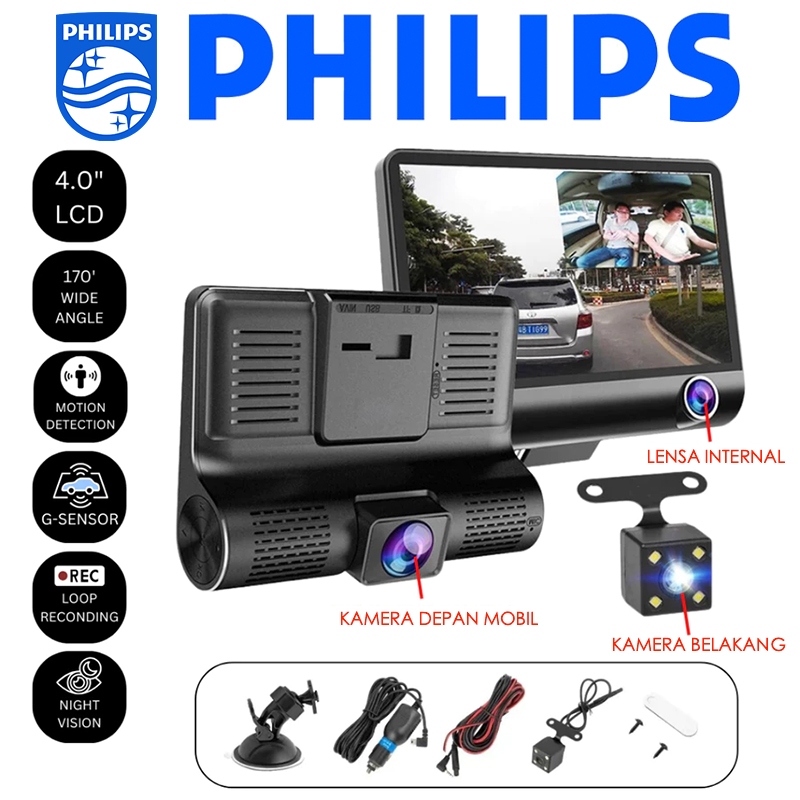 PHILIPS cctv Dashcam Mobil 3 Cameras 1080p full hd G sensor 4.0 Inch Night Vision Loop Recording