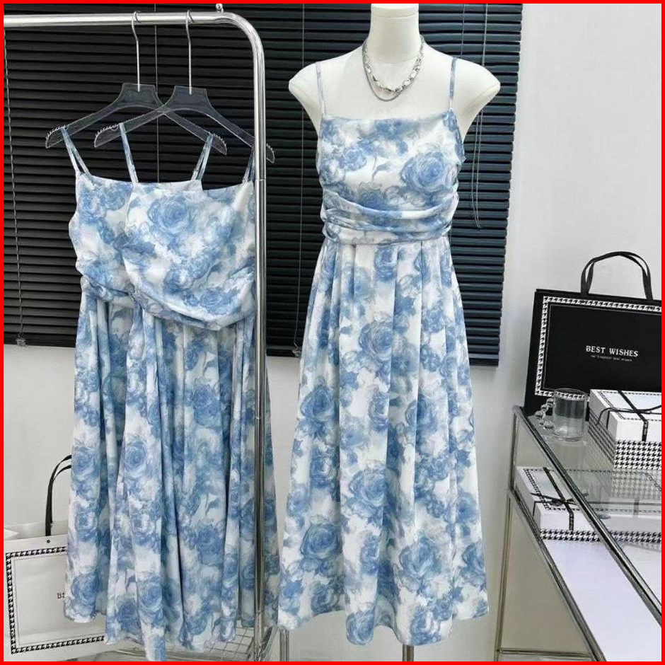 Dress Biru Princess Midi Dress Terbaru 2025 Korean Style Elegant Lengan Pendek Dress Wanita Kekinian Lengan Balon Fairy
