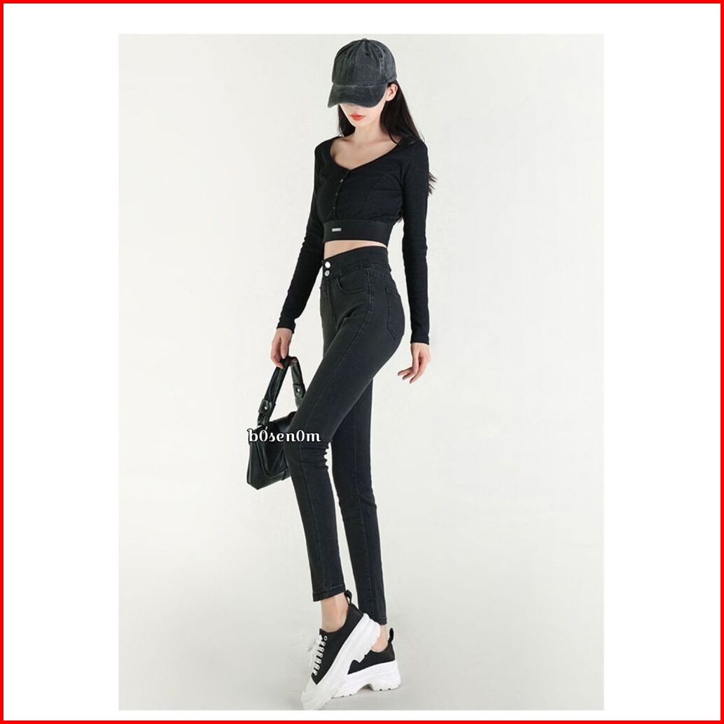 Bosenom- Skinny Jeans Stretchy Hitam Jins Pensil Hitam Highwaist Panjang Wanita Pinggang Silang Pensil Bahan Melar