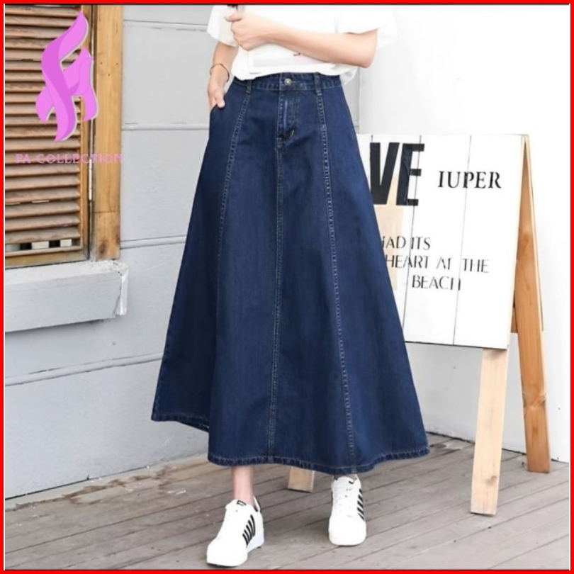 Jisso Rok Jeans Mayung Premium Wanita A- Line 7 8 Model Payung Pinggang Karet - Rok Wanita Hihgwaist Skirt Denim