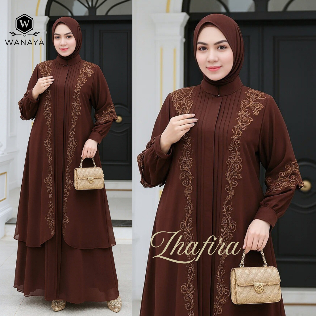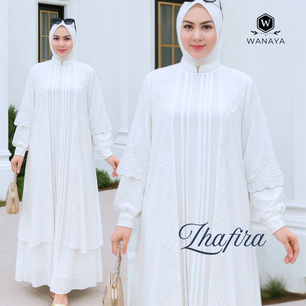 Gamis Zhafira Bahan Ceruty Babydoll Premium Dua Layer Outer Lepas Pasang Motif Bordir Wudhu Friendly