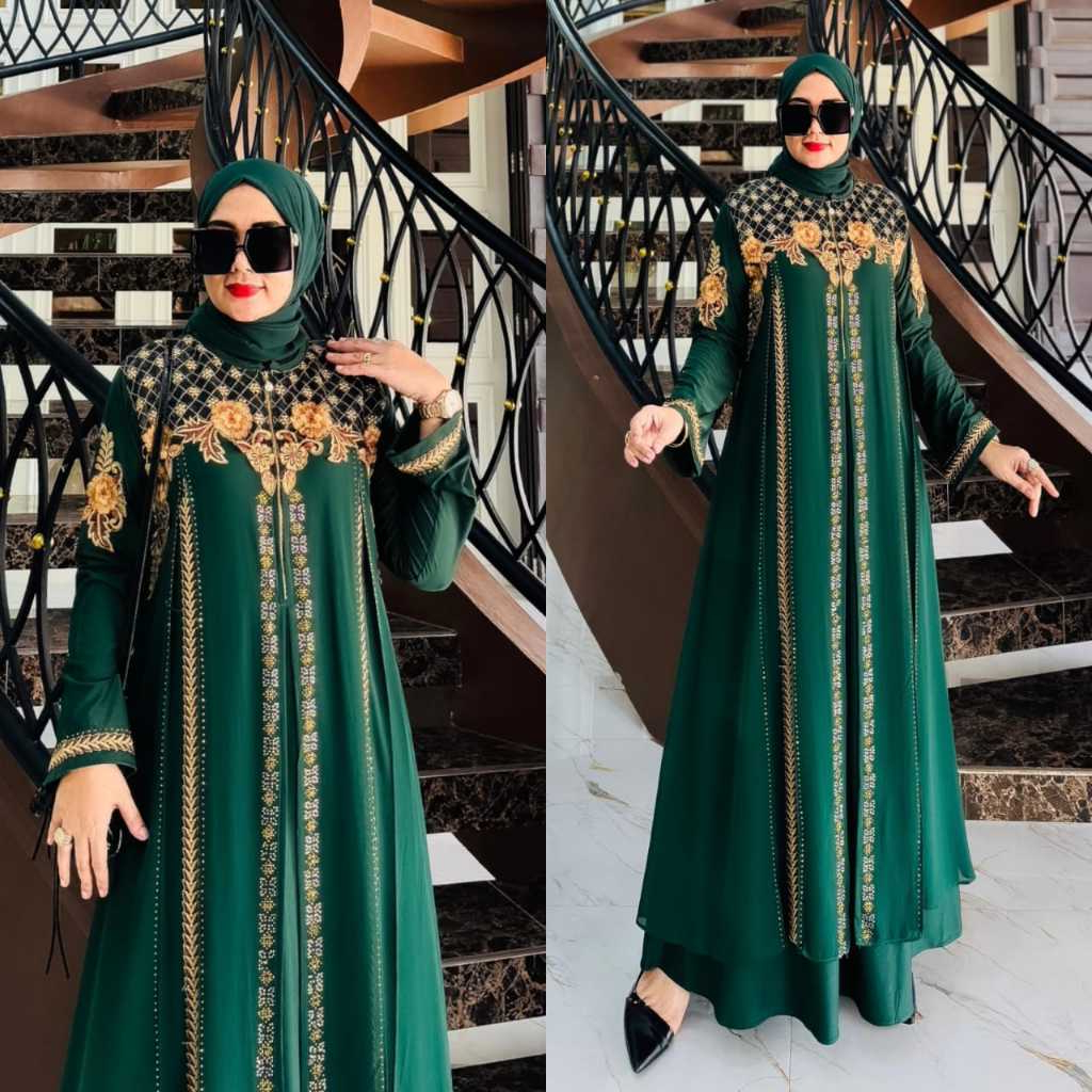Gamis Abaya Turkey Jotol Bahan Jersey Mix Ceruty Bordir / Baju Busana Maxi Dress Muslim Wanita - Mayra Hijau Tua