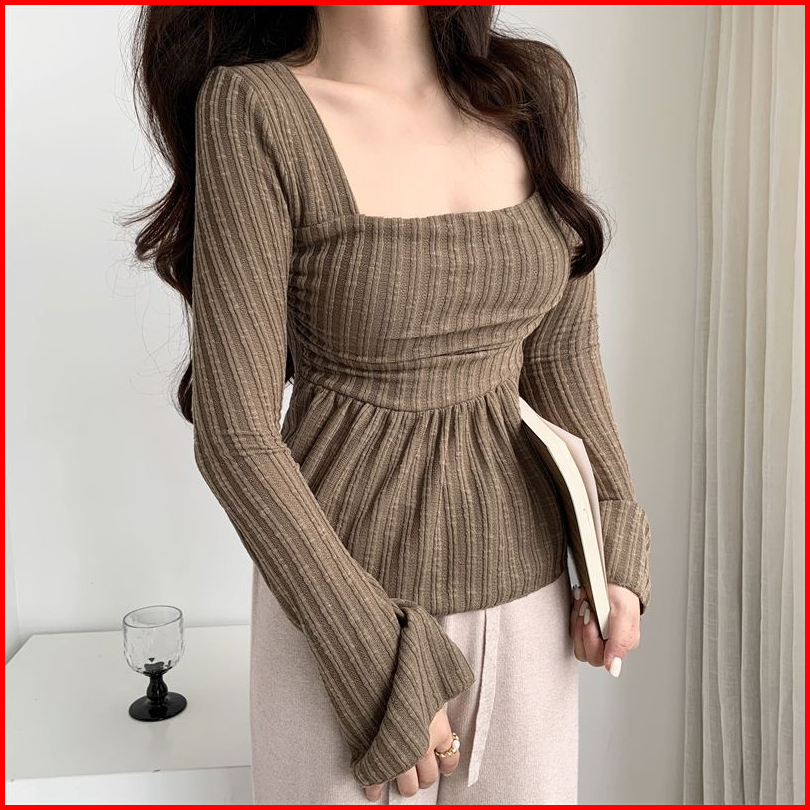 Sexy Square Collar Lengan Panjang T-shirt Wanita Kasual Slim-fit Cover Top Musim Gugur Lengan Lonceng Kaos Polos