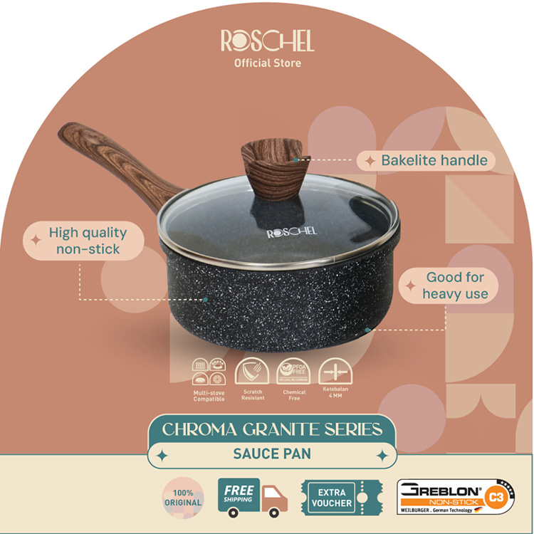 Roschel Chroma Granite Saucepan 16 cm , 18 cm + Tutup Kaca Non-Stick Greblon C3 German Coating Panci Susu Anti Lengket S