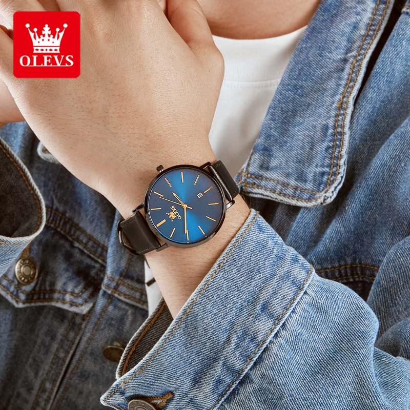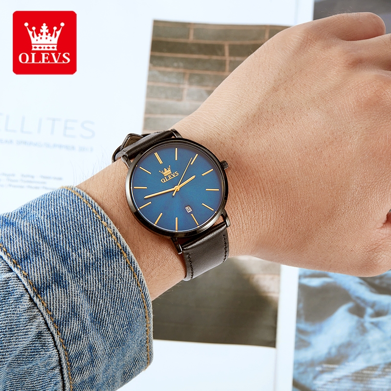 OLEVS Jam Tangan Pria Anti Air Original Ultra Tipis Analog Kalender Tahan Tali Kulit Kuarsa Asli Hitam 5869