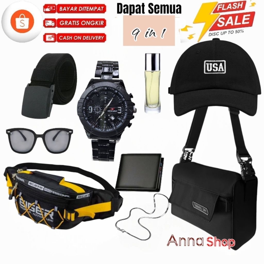 [ANNA SHOP] Paket Terlengkap Bundling 10 in 1 Dapat Topi Tas Jam Tangan Gesper Ikat Pinggang Dompet Kacamata Parfum Unisex Pria dan Wanita
