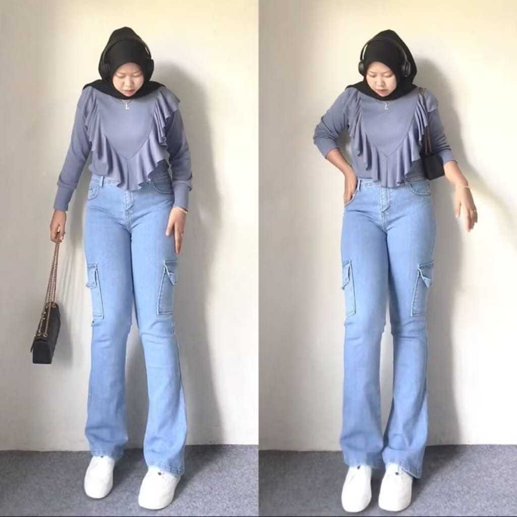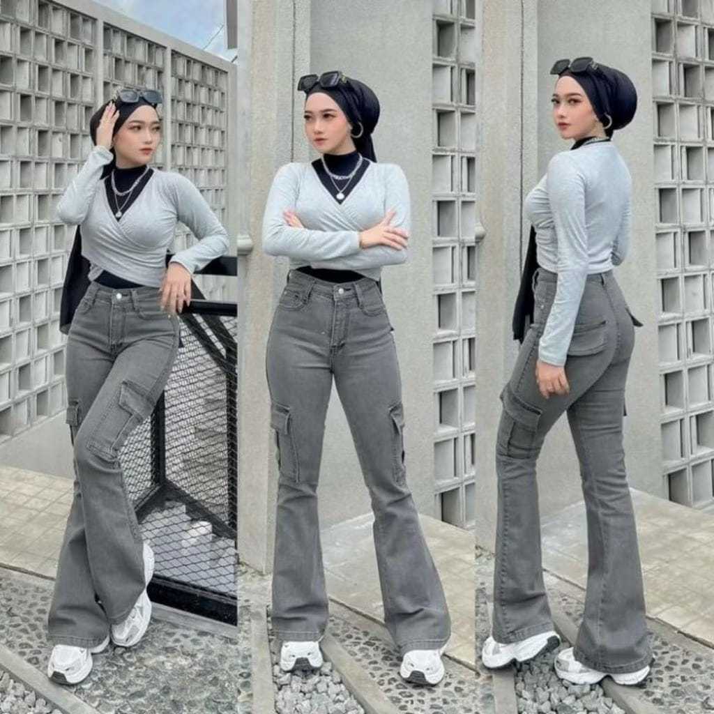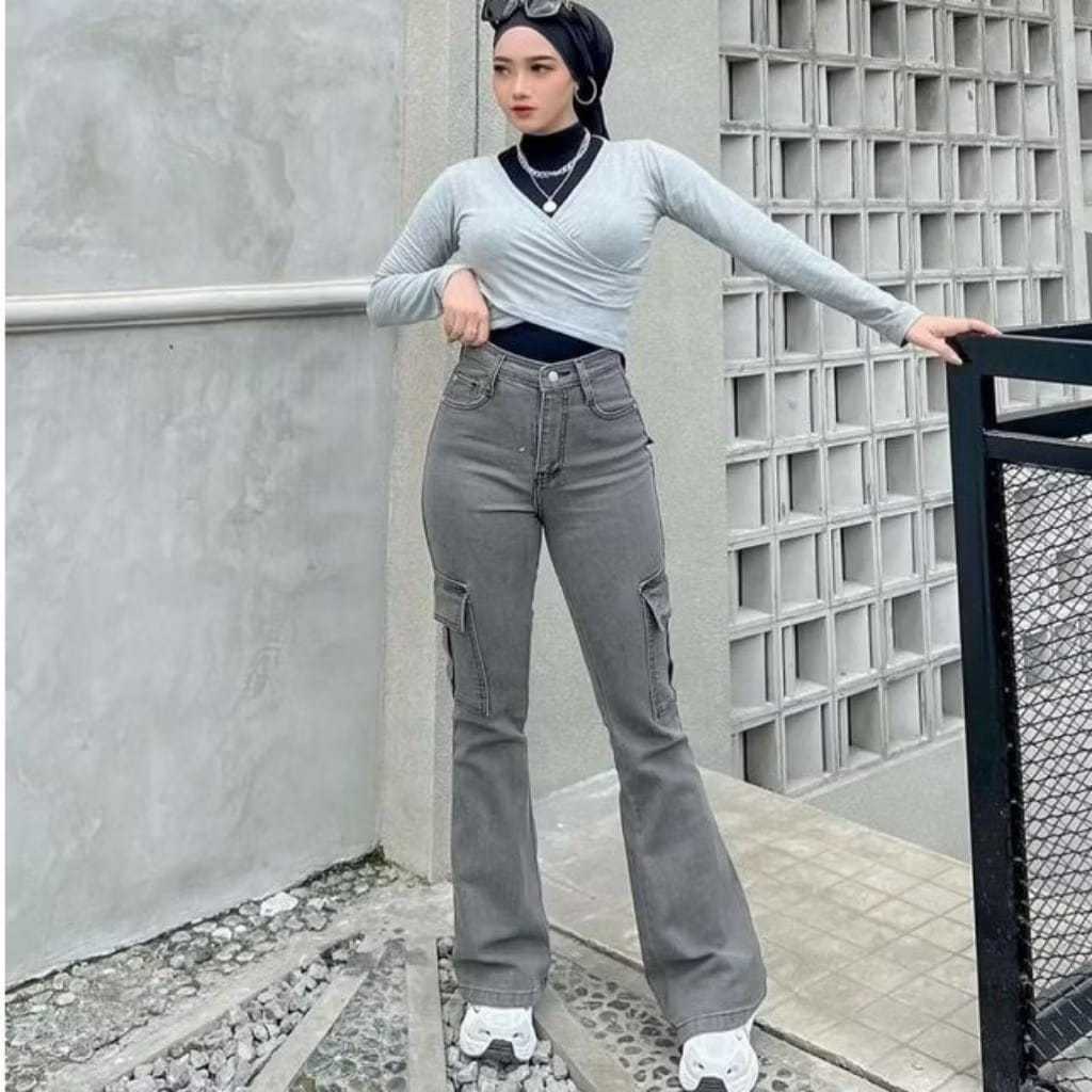 Celana Jeans Panjang Cutbray Cargo Wanita Kulot Highwaist Loose Stretch Melar Jumbo Viral