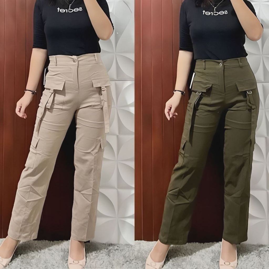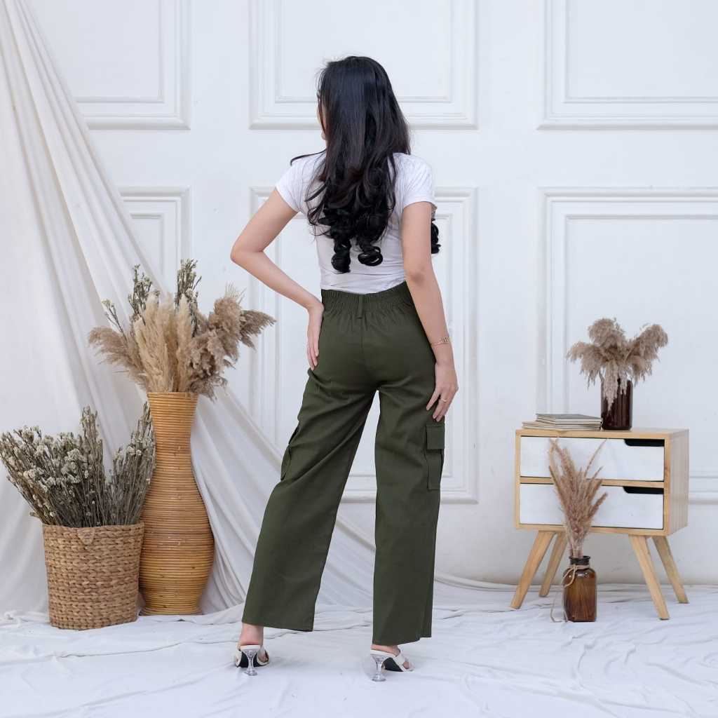 Olivia Celana Cargo Wanita - Celana Panjang Cargo Strech Katun Twill Kulot Wanita Highwaist