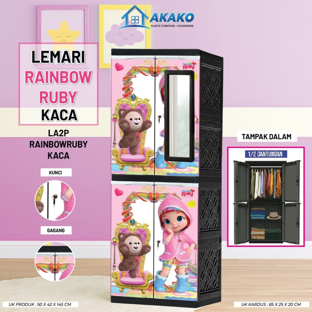 Lemari Pakaian Plastik 2 Pintu LA2P Cermin | Lemari Baju 4 Susun Motif Karakter | Cermin Kaca Bagus & Kokoh