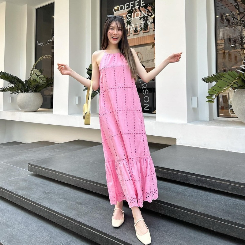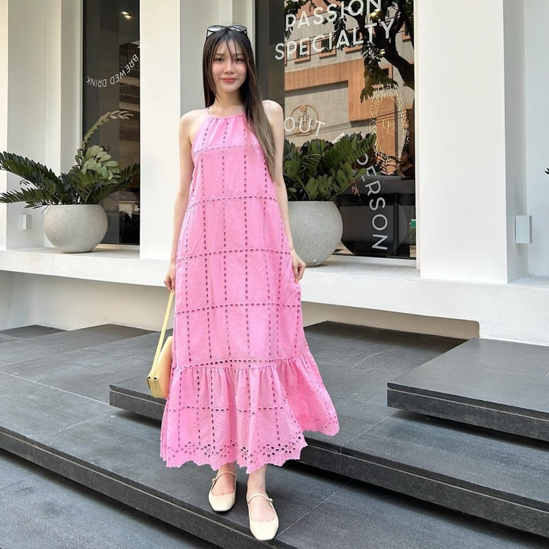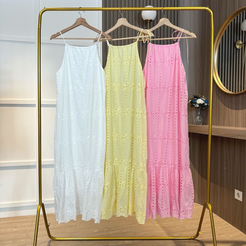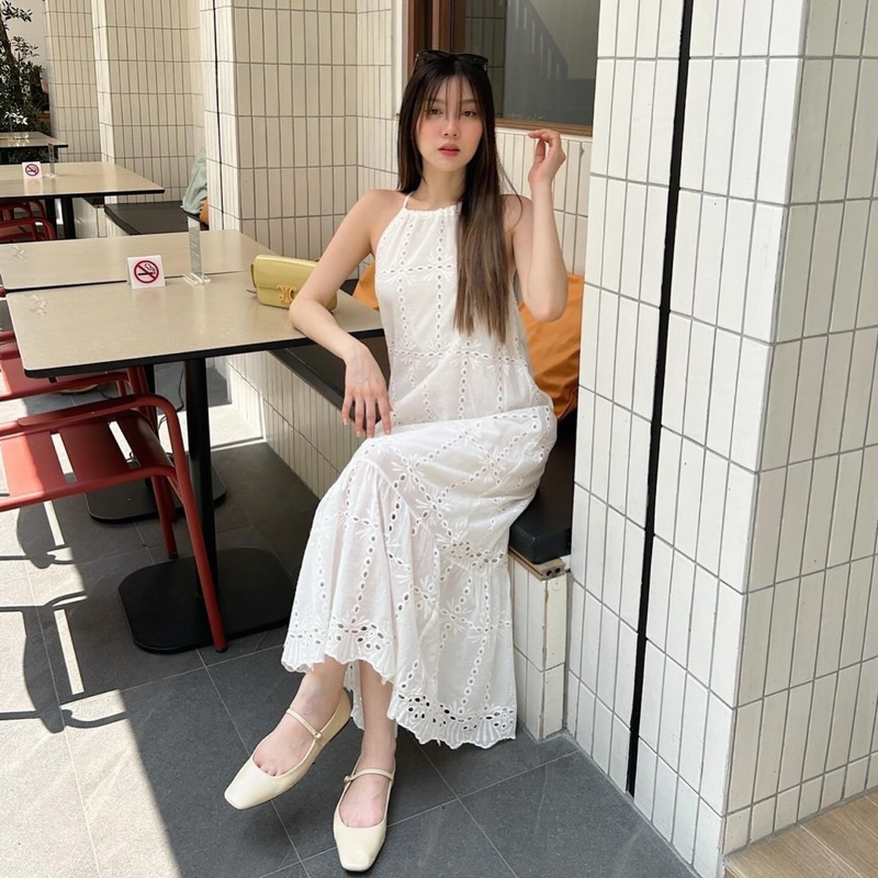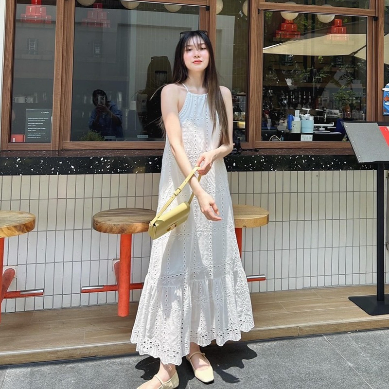 D1613 LILIAN KOREAN STYLE EYELET VINTAGE MAXI DRESS HALTER PANTAI SIMPLE POLOS KATBOL BALI