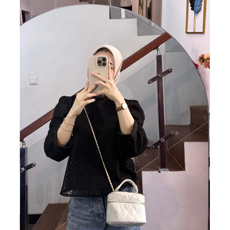 MOONLIFE BLOUSE KARTIKA KEMEJA WANITA LENGAN PANJANG DOUBLE BRUKAT LUCU WARNA HITAM DA PUTIH TREND FASHION BAJU WANITA