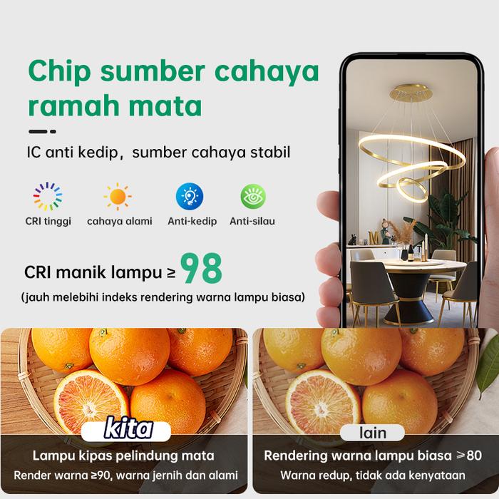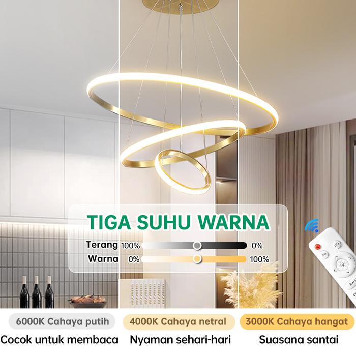 Lampu Gantung Kristal Modern 3-Cincin Lampu Gantung Ruang Tamu Kamar Tidur 3 Warna Lampu Hias Hitam - Emas+Remote