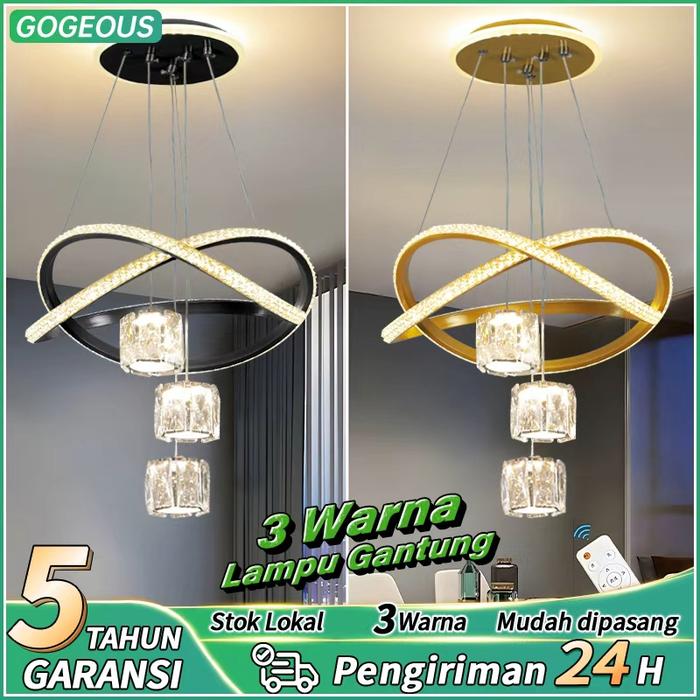 Lampu Gantung Kristal Mewah 3Warna 90W LED Lampu Gantung Ruang Tamu Minimalis Kamar Tidur Hias - Hitam+Remote