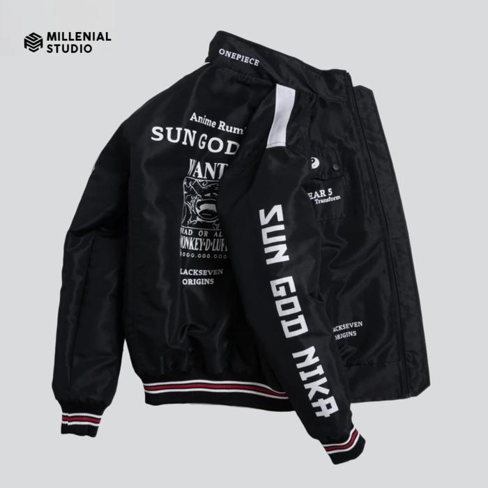 BOMBER JACKET ONE PIECE HITAM SUN GOD NIKA BLACKSEVEN JAKET WATERPROOF ANIME BIKER PRIA WANITA