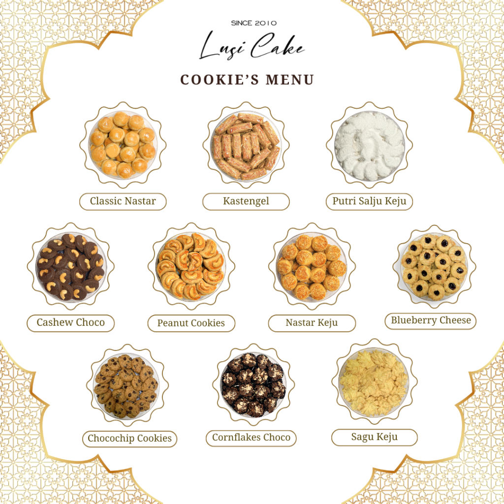 Classic Nastar, Nastar Keju, Kastengel, Putri Salju Keju, Blueberry Cheese, Cashew Choco, Peanut Skippy, Chocochip Cookies, Sagu Keju, Cornflakes Choco