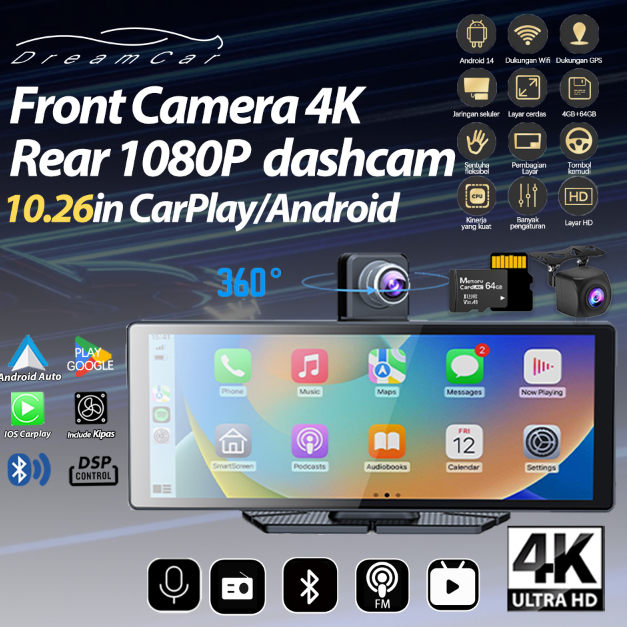 Dashcam Mobil 360 Rotatable Lens GPS Navigation 4K HD Layar Sentuh Lensa Ganda Perekaman Loop Deteksi Gerakan Carplay Ca