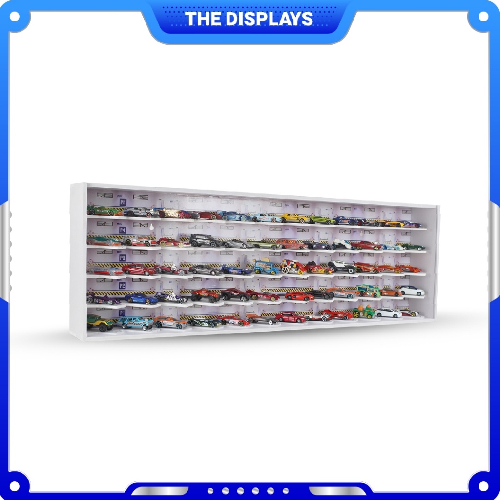 Rak Display Hotwheels Serong PVC Board Kapasitas 60 Mobil dengan Background