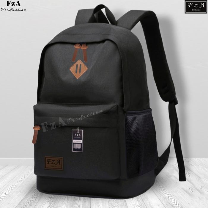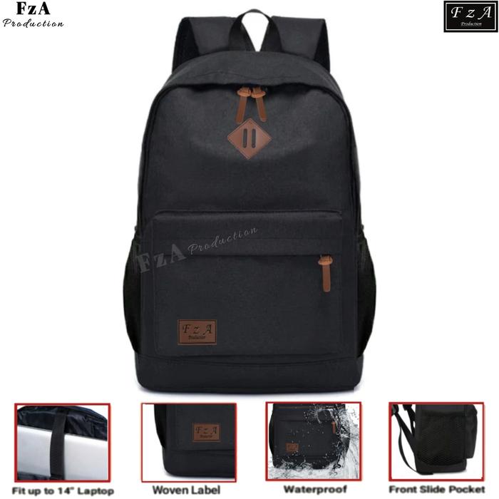 FZA PRODUCTION TAS RANSEL DISTRO ORIGINAL CASUAL PRIA WANITA A1 - HITAM DENGAN WATER REPELLENT & SEKAT LAPTOP 14 INCH - BONUS JAM TANGAN & DOMPET - BLACK +