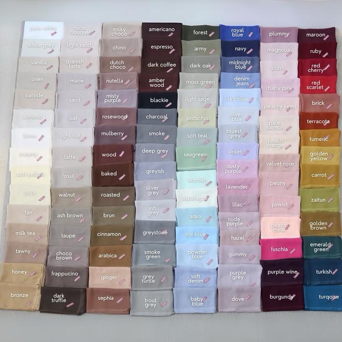Almond, Aqua, Army, Ash Brown, Ash Grey, Asparagus, Baby Blue, Baby Pink, Blackie, Blues Grey, Blush, Bone, Brown Latte, Brownies, Burgundy, Carrot, Chino, Creamy, Dark Oak, Deep Grey, Denim Jeans, Dove, Dusty Purple, Emerald Green, Forest, Frappucino, Fuschia, Ginger, Greyish, Greystone, Hazel, Ice Blue, Lavender, Light Sage, Lime, Magnolia, Maroon, Midnight Blue, Milk Tea, Milky Choco, Mustard, Navy, Nude purple, Nutella, Oat, Pale Salmon, Peach Orange, Peachy Ken, Peony, Pinkie Dust, Pinkish, Pistachio, Powder Blue, Pure White, Purple -, Red Scarlett, Rosewood, Royal Blue, Ruby, Sand, Sea Green, Seaweed, Silver Blue, Silver Grey, Sky Blue, Smoke Green, Soft Denim, Soft Teal, Soft Yellow, Tan, Taro, Teracotta, Trout Grey, Turkish, Turqoise, Vanilla, Velvet Rose, Violet, Walnut, Wardah, Wood, Zaitun