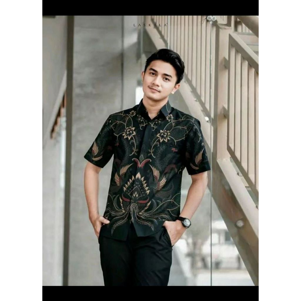 Baju Batik Pesta Kondangan Pria Lengan Pendek Polimikro Warna Hitam