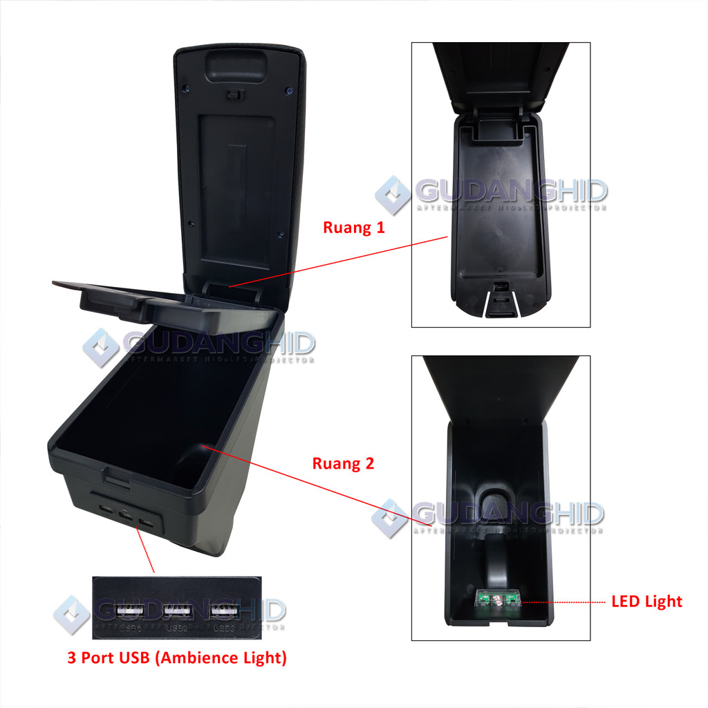 Armrest Mobil Khusus Honda Brio Mobilio BRV Luxury 3 USB Port Charger + LED Kulit