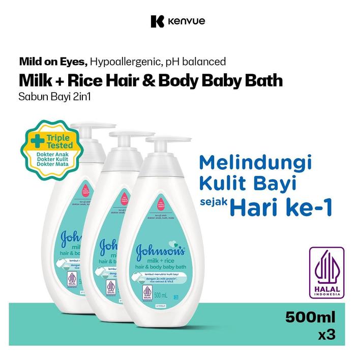 JOHNSON'S Milk + Rice Hair & Body Baby Bath 500 ml (PAKET ISI 3) - Sabun Mandi Bayi Cair