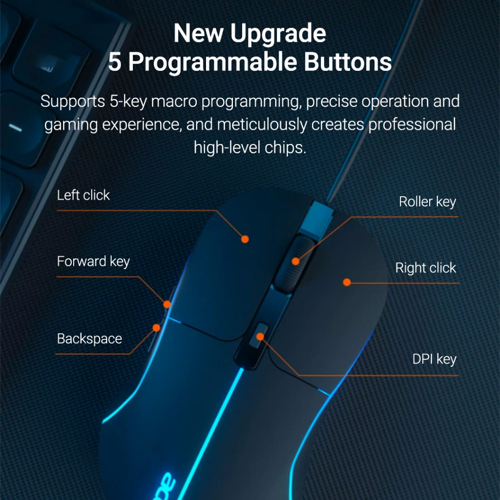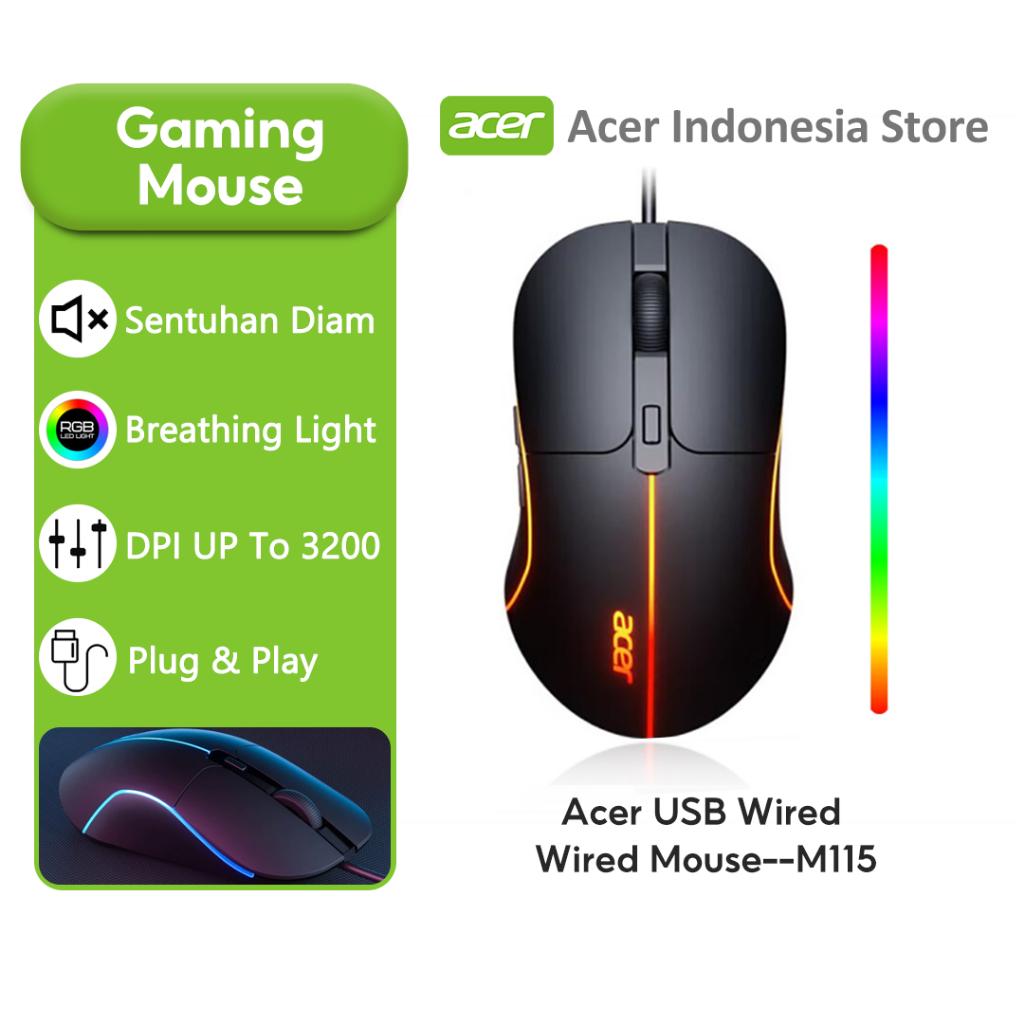 [Star] mouse gaming acer m115 kabel senyap 3200dpl, 6 tombol,untuk esport & kantor,colorful led untuk pc/laptop,original