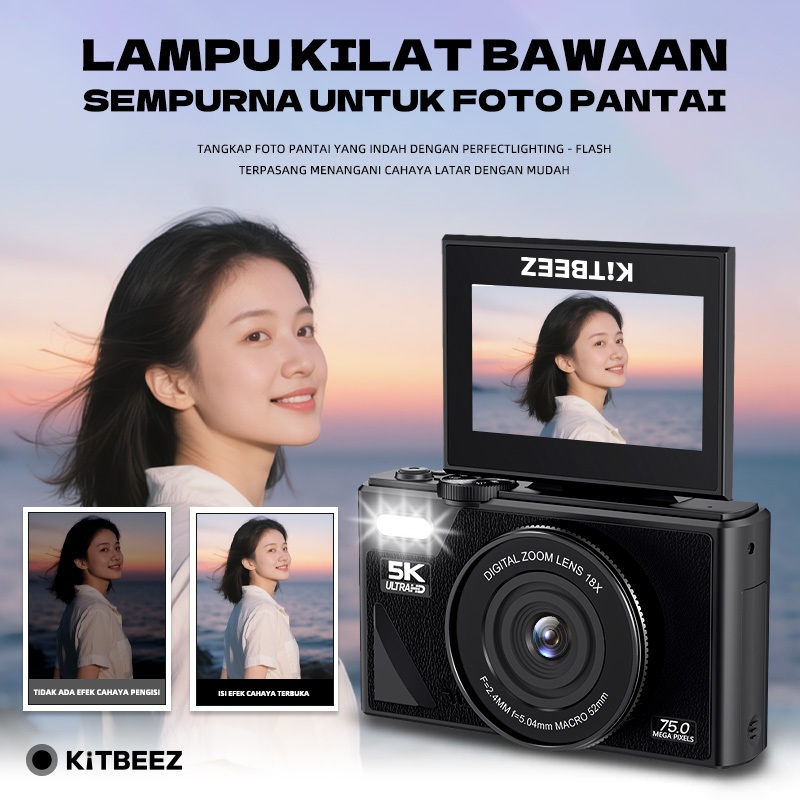 KiTBEEZ KP-2 WiFi Kamera Digital 75MP 5K digicam dengan Layar Boleh Putar 180° Zoom 18x Dukungan Selfie WiFi Transfer Kamera Murah Retro DSLR