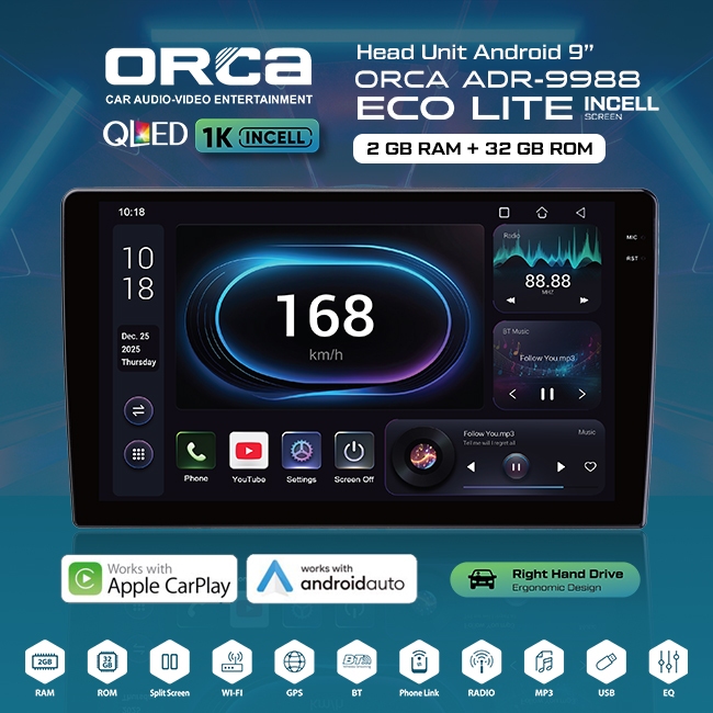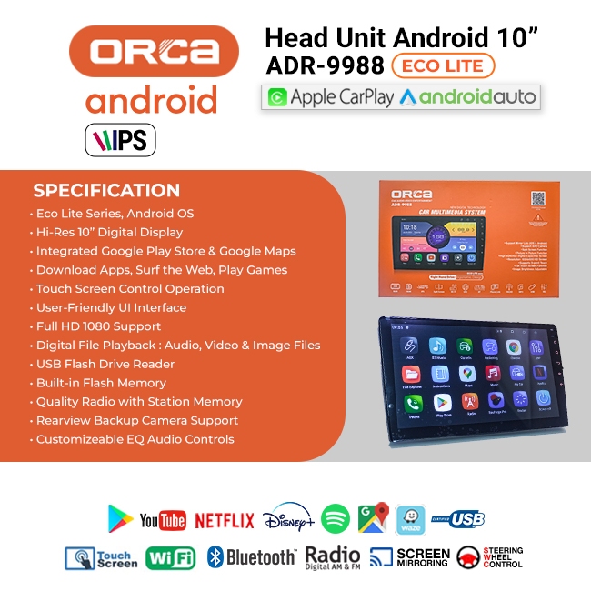 Head Unit TV Android 9 / 10 inch ORCA ADR-9988 ECO LITE Support Android Auto & Carplay 2GB/32GB