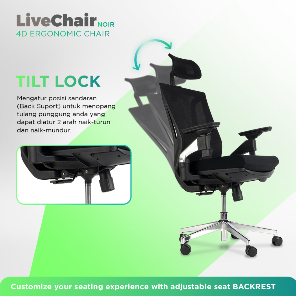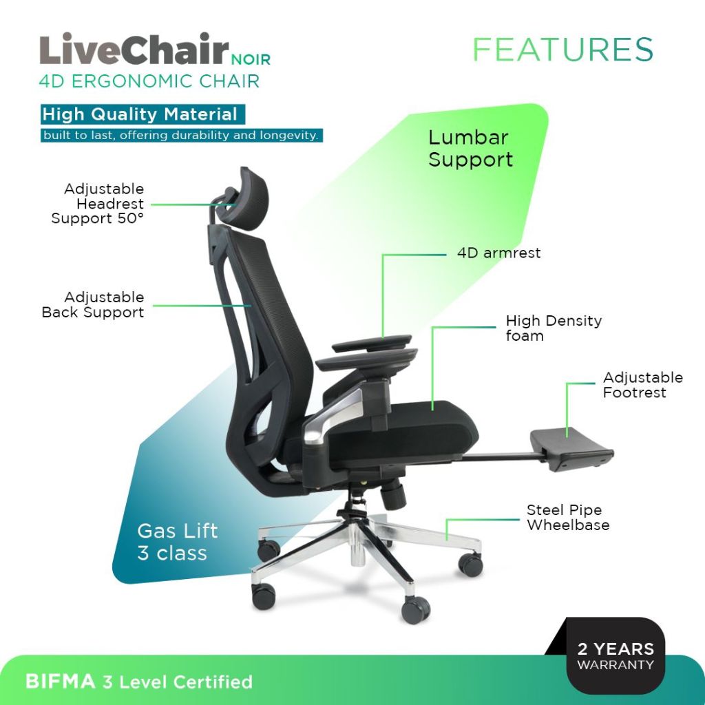 LiveChair Noir Kursi Kantor Ergonomic Work Office Chair Mesh Footrest