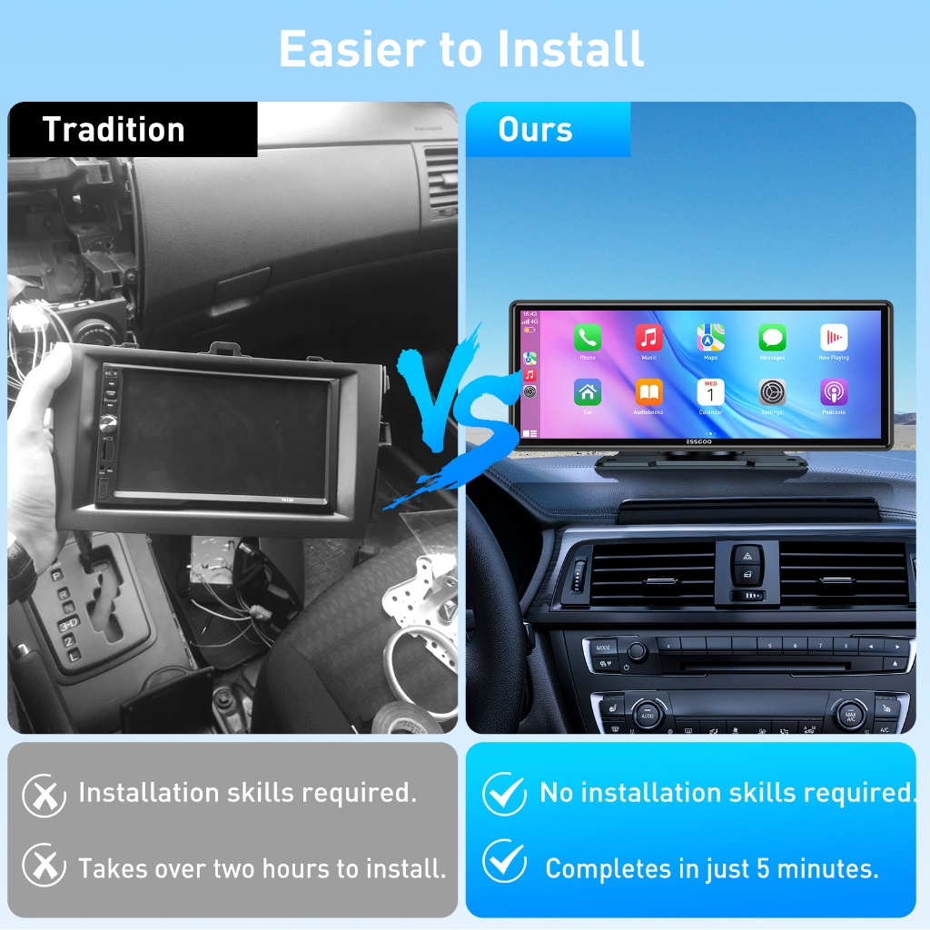 ESSGOO 10inci Portable Carplay Nirkabel Portabel Multimedia Mobil Layar Sentuh Monitor IPS FHD