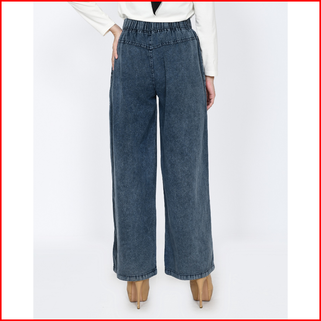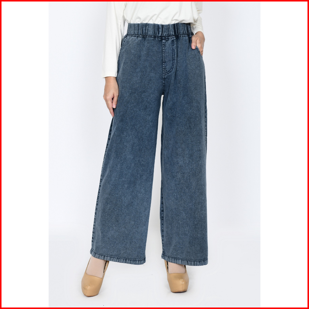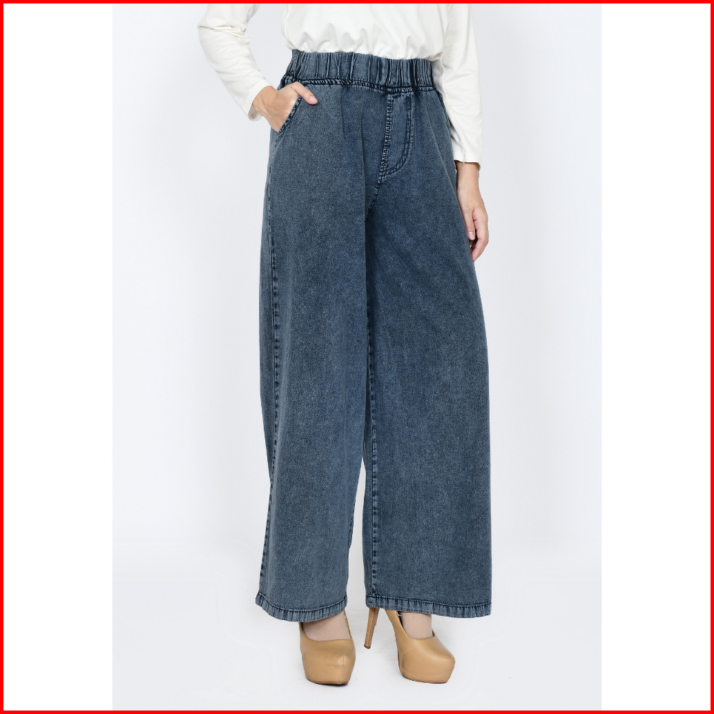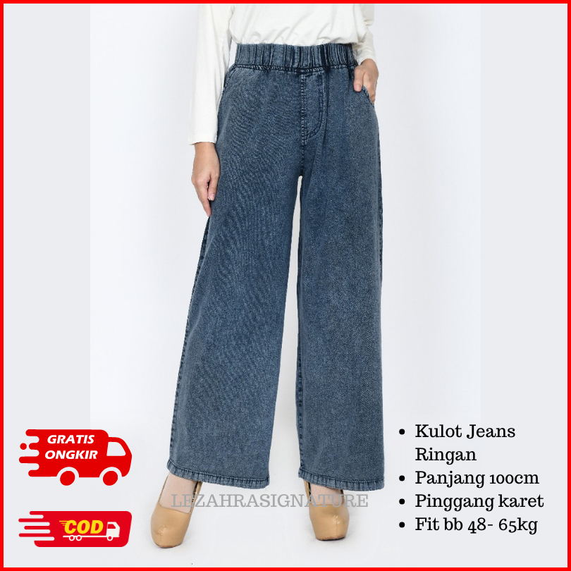 Celana Kulot Jeans Muslim Wanita Panjang 100cm Pinggang Karet Fit 48-65 Kg Lezahrasignature Cullote Kelly Snowblack