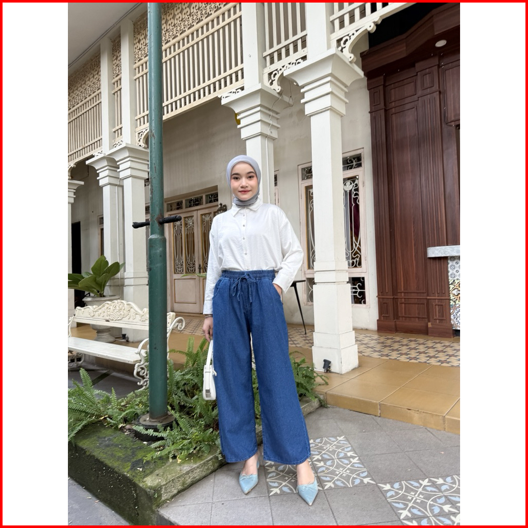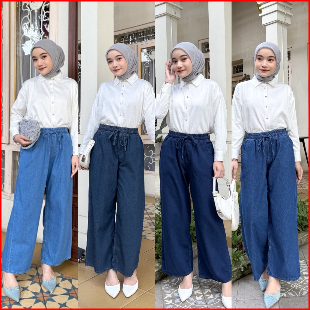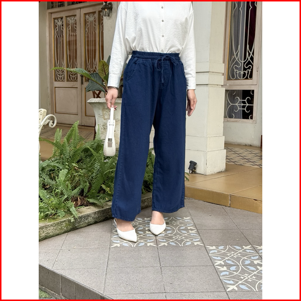 Celana Kulot Highwaist Soft Jeans Wanita Fit Xxl Bigsize Jumbo Pinggang Karet Tali Serut Saku Belakang Kulot Jeans Eclo